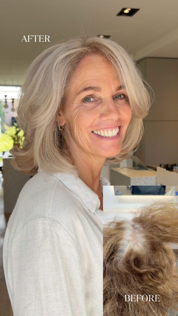 Het is een professionele kleurservice die grijs haar niet volledig bedekt, maar zacht en natuurlijk blendt met de rest van het haar. Het resultaat? Geen harde uitgroei, maar een verfijnde overgang die met het haar én met de tijd meebeweegt.